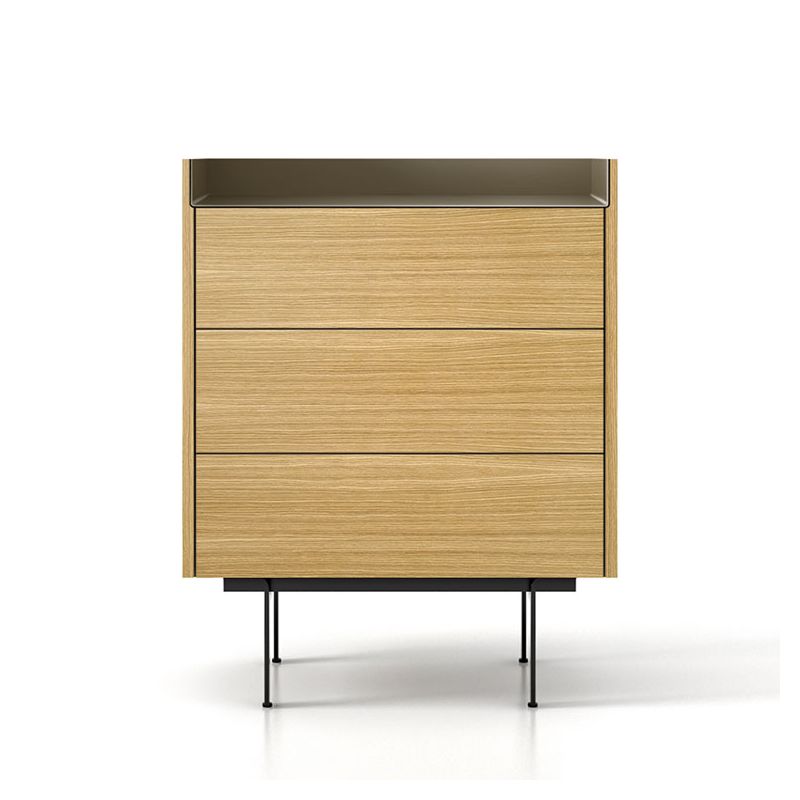 | Détails | 3 tiroirs avec glissières à extraction totale, Dessus finition aluminium anodisé teinté, Socle en acier thermolaqué noir, Pieds thermolaqués coloris noir, Structure en panneaux MDF à très faible teneur en formaldéhyde, Intérieur et extérieur plaqué chêne naturel, plaqué chêne teinté ou plaqué noyer |