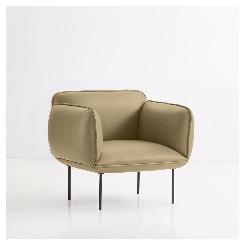 Le fauteuil de salon en cuir Nakki se distingue par son rembourrage intégré dans l'assise et des pieds tout droits très sobres. Un parti pris créatif commun à tous les meubles de la collection, qui leur confère une silhouette légère et une allure moderne.