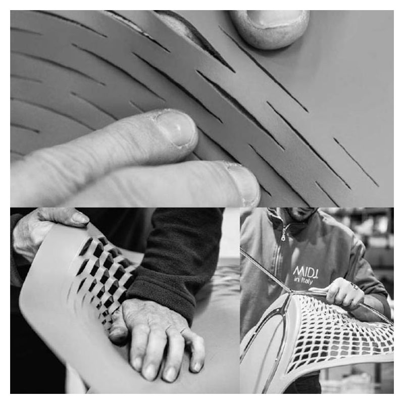 | Détails | Cuir bovin d'origine européenne tanné en Italie, peaux sélectionnées pour leur épaisseur, leur souplesse, leur résistance et leurs qualités esthétiques, Résille de cuir travaillée artisanalement, Pieds équipés de patins protecteurs anti-rayures, Piètement acier laqué ou chromé, Assise en cuir lisse rembourré, Dossier ergonomique formant accoudoirs en cuir résille |