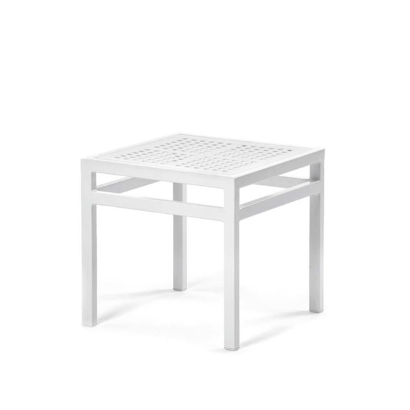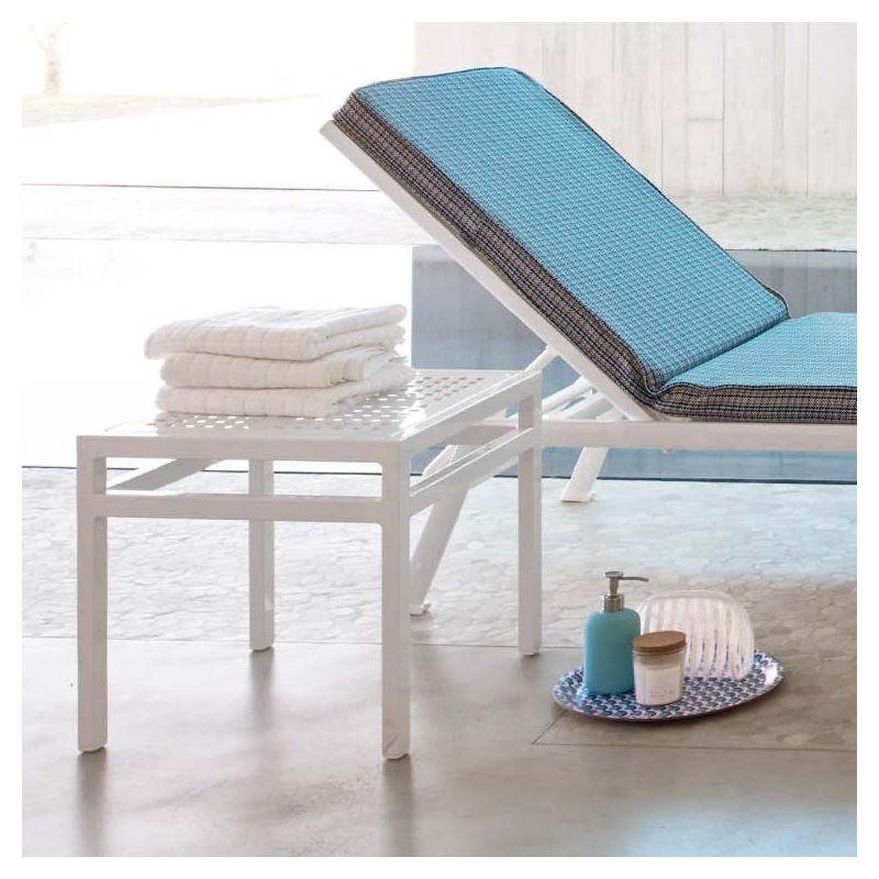 Parfaite avec le bain de soleil Victor, cette petite table basse carrée se rend vite indispensable l'été au jardin ou près de la piscine. Design Varaschin, tout aluminium...