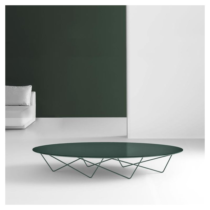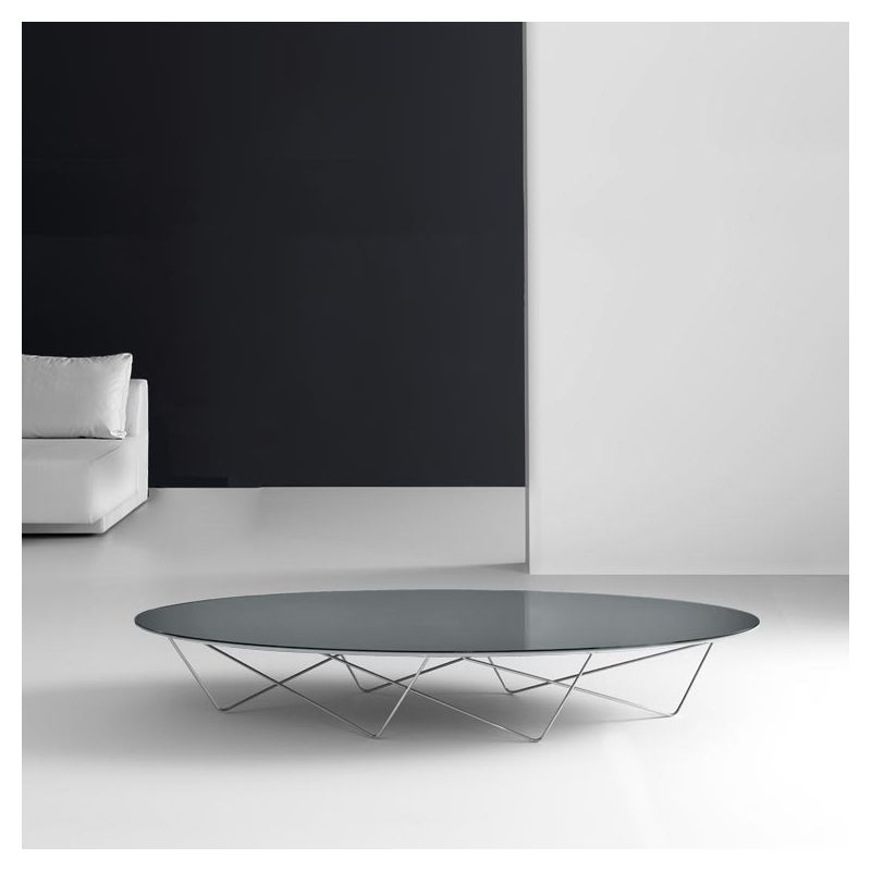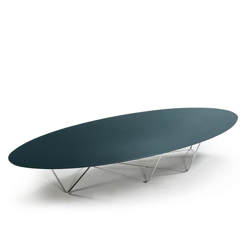 | Détails | Piètement métallique composé de pieds épingle enchevêtrés laqués, chromés ou thermolaqués noir, Plateau ovale laqué, plaqué bois, verre laqué noir, miroir gris ou miroir bronze, |