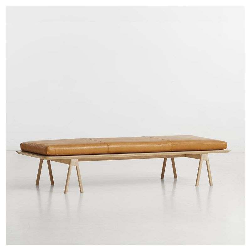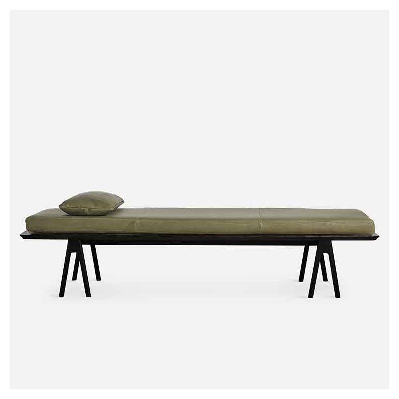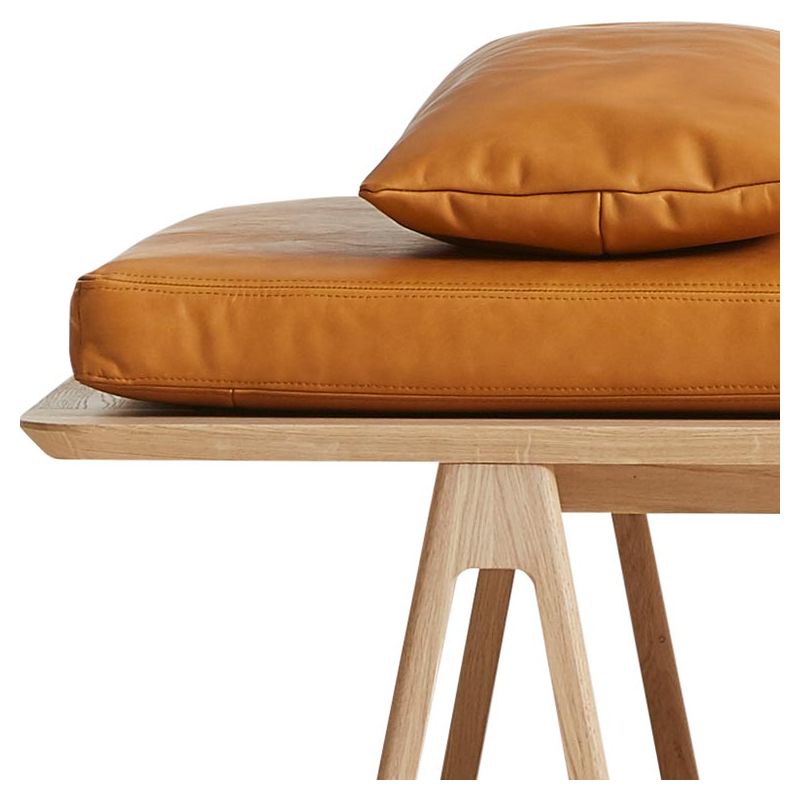 | Modèles disponibles en ligne | Structure et pieds : chêne massif blanchi ou chêne massif teinté noir, Matelas revêtu cuir Silk Camo : coloris cognac ou coloris noir, Avec coussin rectangulaire déhoussable par fermeture à glissière, garni mousse et fibre, L 67 x P 23,5 x h 8,5 cm coloris identique au matelas, Sans coussin |