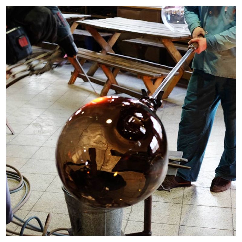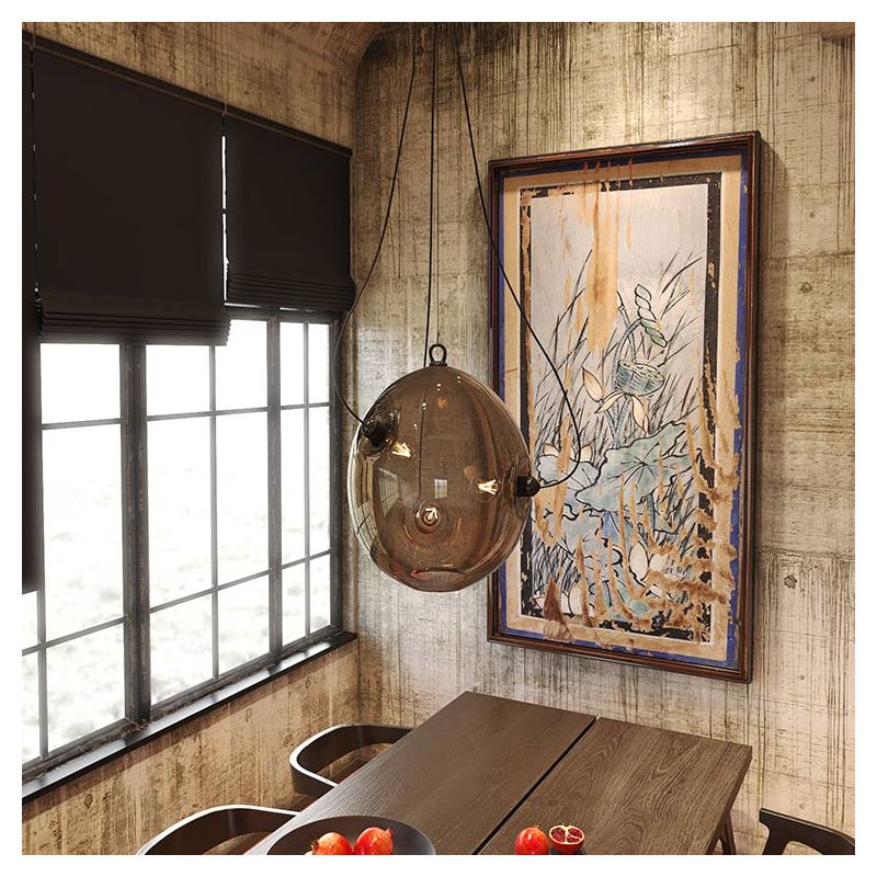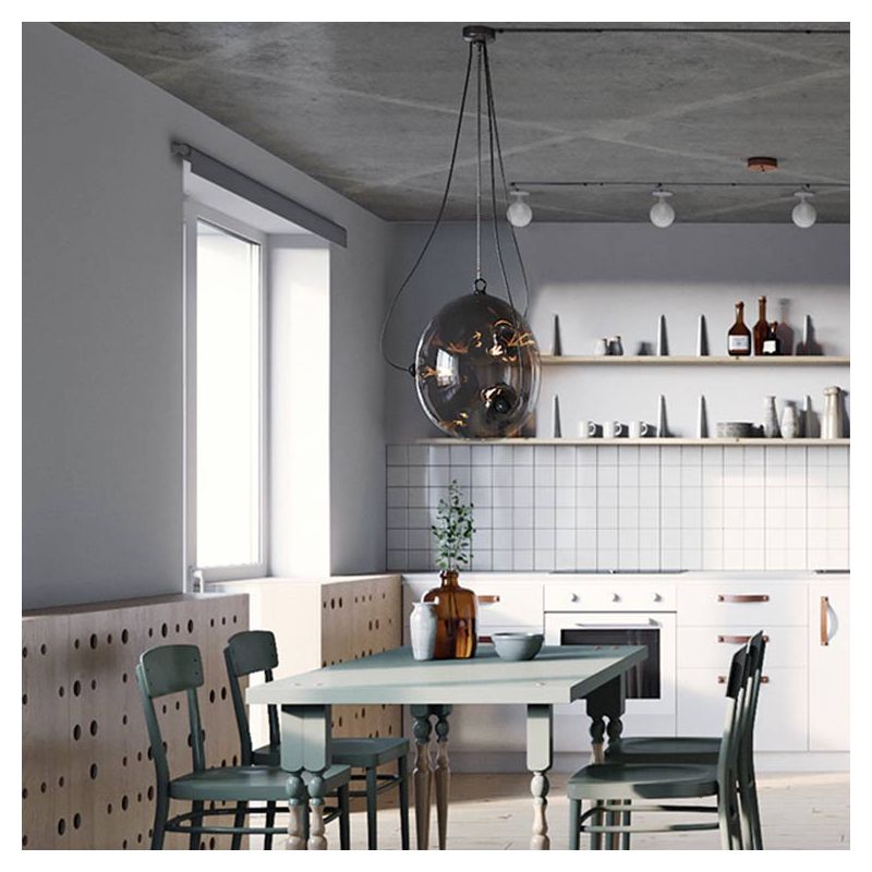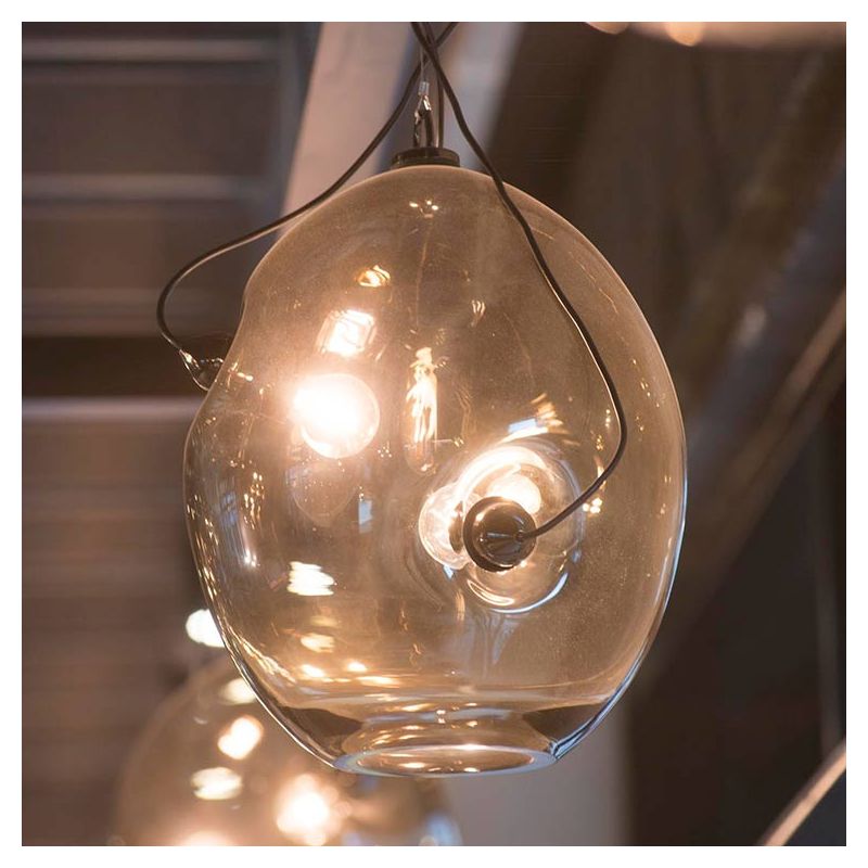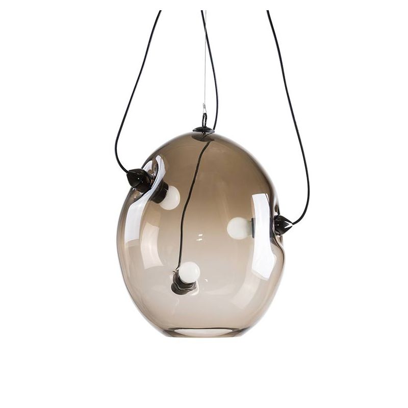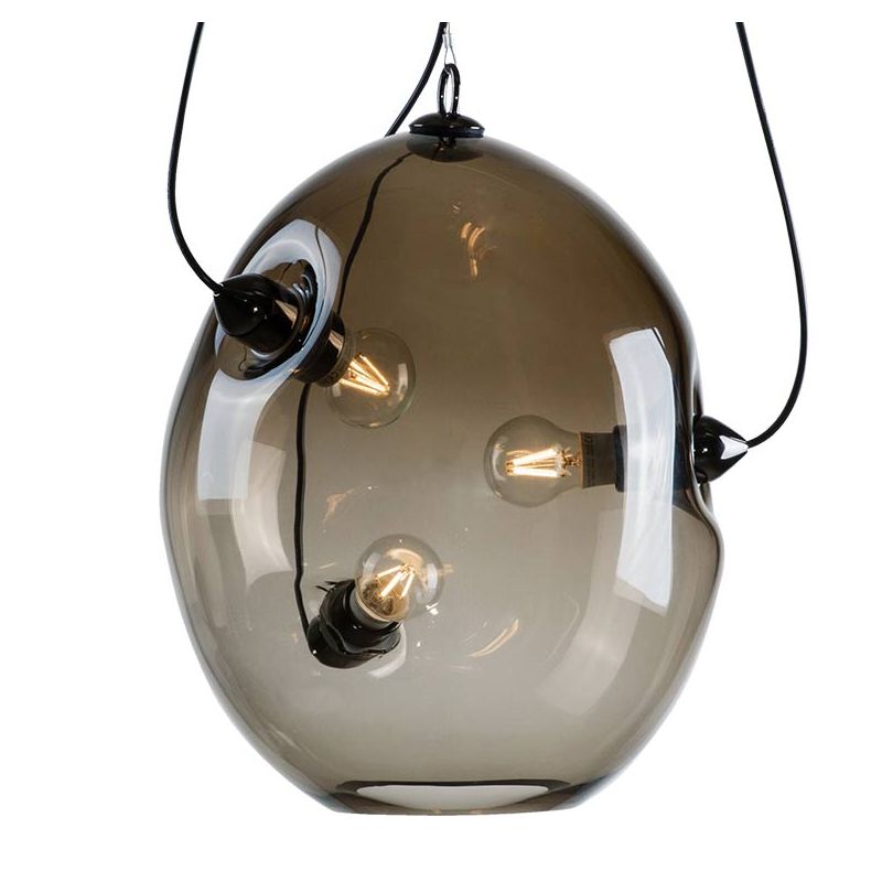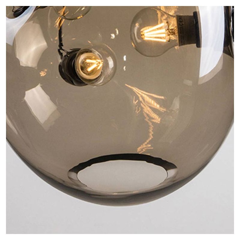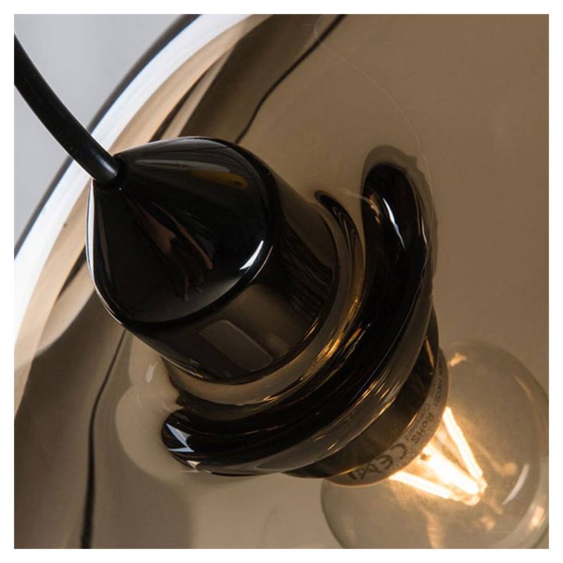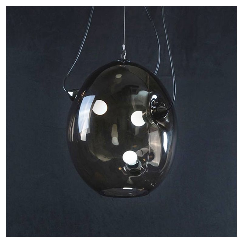 | Détails | Abat-jour en verre fumé soufflé à la bouche, Jointures et détails en bronze poli teinte canon de fusil,, Rosace cache-fil forme demi-sphère en bronze poli, Câbles d'alimentation connectés aux 3 sources revêtus PVC noir, hauteur ajustable max. 4 m, Câble de suspension en acier, Fabrication artisanale, Chaque exemplaire est unique |
