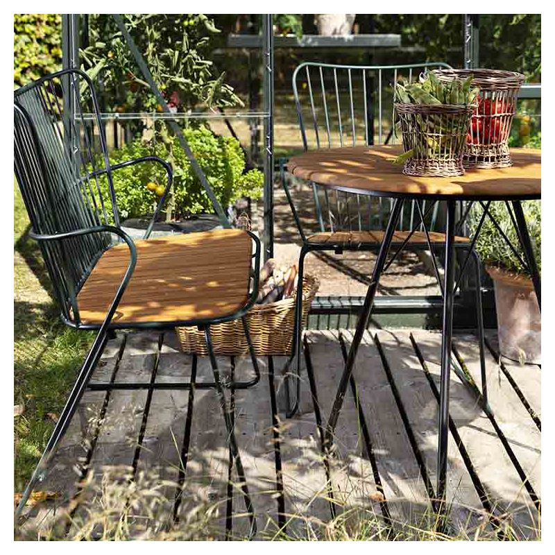 | Détails | Chassis tubulaire en acier Ø 19 mm finition thermo-laqué époxy noir, Plateau rond Ø 74 cm en bambou ou aluminium |