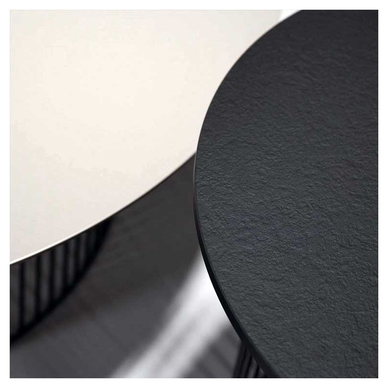 | Détails | Base en métal cylindrique formant le pied central, Finition thermolaquée microtexturée, Plateau avec chant biseauté rond autour d'un plateau céramique, ardoise ou verre laqué noir |