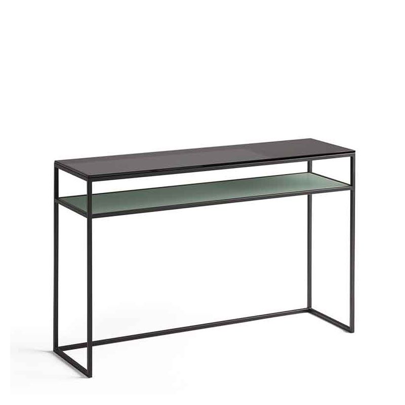 | Détails | Console composée d'un plateau en verre trempé gris fumé de 10 mm d'épaisseur, ossature métallique de section carrée thermolaquée noire microtexturée. Etagère finition MDF laqué, placage noyer ou chêne |
