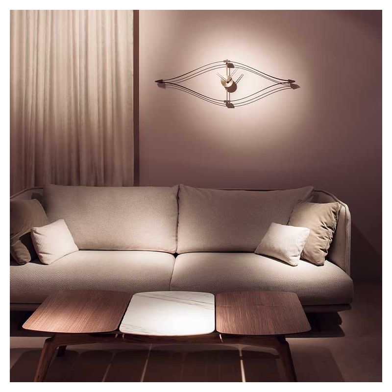 Avec sa forme captivante, l'horloge murale Mini Look Nomon focalise les regards. En laiton poli, noyer et fibre de verre, design raffiné, fait-main, mécanisme silencieux...