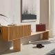Un conteneur linéaire géométrique et rigoureux, où les portes, de manière inattendue, sont gravées d'un motif vertical. Soulignant très légèrement le grain de l'essence, lié à l'élément architectural de l'étagère, dans une sorte d'équilibre délicat qui semble presque créer une sculpture suspendue dans le temps. Il est important de mettre en valeur les joints qui créent les tangentes entre les éléments, un haut niveau de savoir-faire qui rend le résultat surprenant.