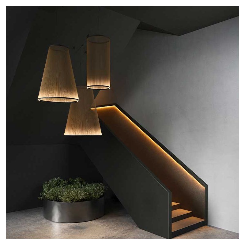 Suspension Array Ø 55 cm composée d'une série de fils techniques tendus entre deux anneaux. La lumière s'élève pour former un dégradé chromatique.