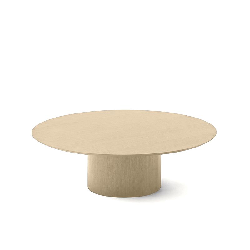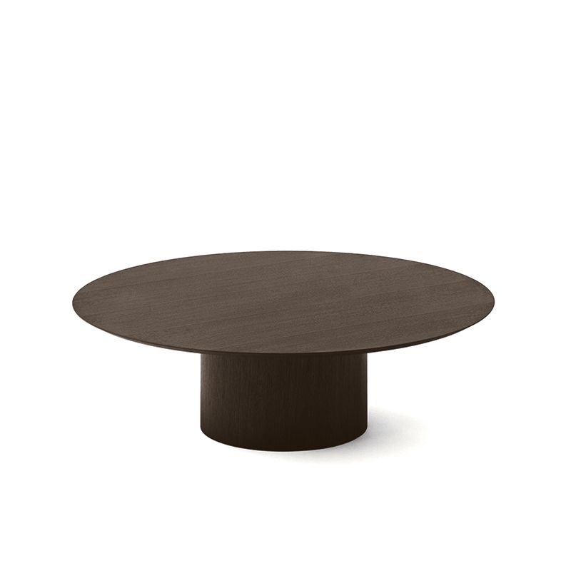 Table basse d'un diamètre de 120 cm pour son plateau et d'une base cylindrique d'une hauteur de 38 cm.
