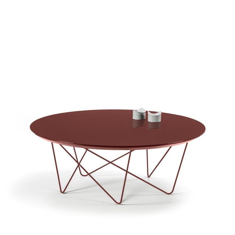 | Détails | Piètement métallique composé de pieds épingle enchevêtrés laqués, chromés ou thermolaqués noir, Plateau rond laqué, plaqué bois, verre laqué noir, miroir gris ou miroir bronze, |