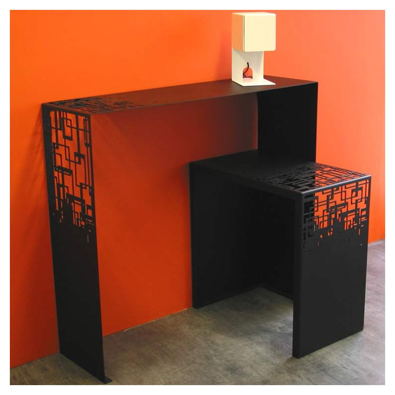 Ce bout de canapé, utilisable en chevet ou table d'appoint, reprend le design original de l'ensemble de la collection de meubles, qui ont en commun l'emploi du métal et la forme sobre percée d'un dessin géométrique original.